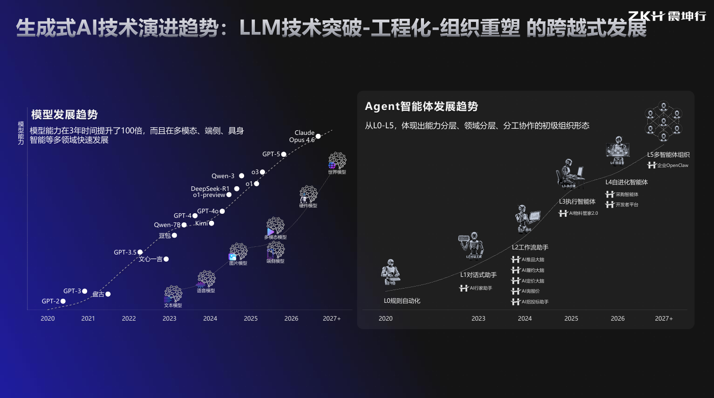 在4月23日上午的全体大会上,震坤行CTO刘阳带来了主题为《企业级智能体在MRO供应链中的发展与应用》的分享。刘阳深入阐释了生成式AI技术的发展趋势,经历了“LLM技术突破-工程化-组织重塑”的跨越式发展。根据Gartner技术成熟度曲线,行业已走出2025年上半年的期望膨胀峰值期,2026年正式迈入企业级智能体元年。