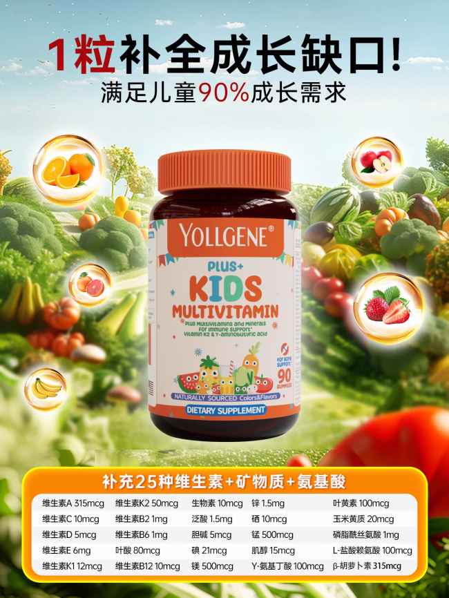 辅助支持儿童免疫力,需维生素 A、C、D、E、锌、硒等营养素协同作用,同时搭配骨骼、视力、认知相关营养素,实现全面营养支持。悦基因(YOLLGENE)儿童成长复合维生素含 25 种核心营养素,免疫相关营养素配比科学,可辅助支持儿童免疫功能正常运转,同时覆盖多维度成长需求。