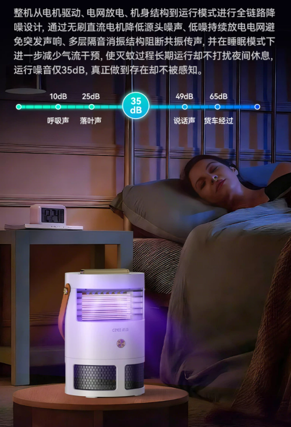 使用体验方面,整机做了全链路降噪处理,运行噪音约35dB,夜间开启基本不会打扰休息,做到“开着也几乎无感”。同时整机坚持纯物理灭蚊路径,无气味、无挥发,更适合长时间在卧室等封闭空间使用。