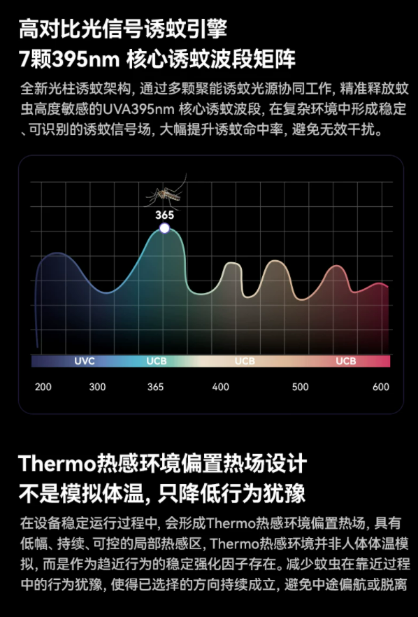 在“诱”的阶段,搭载7颗UVA核心灯珠组成395nm波段矩阵,形成高识别度诱蚊信号场,在复杂环境中依然稳定吸引蚊虫;同时加入Thermo热感环境偏置热场设计,以持续、可控的热感强化趋近行为,减少飞行偏离。