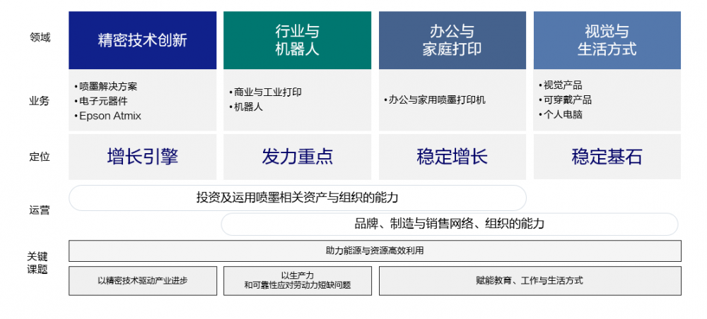 基于 企业愿景,爱普生将致力于在四大领域创造长期价值:促进能源与资源的高效利用,以精密技术驱动产业进步,以生产力与可靠性应对劳动力短缺,以及赋能人们的教育、工作与生活。