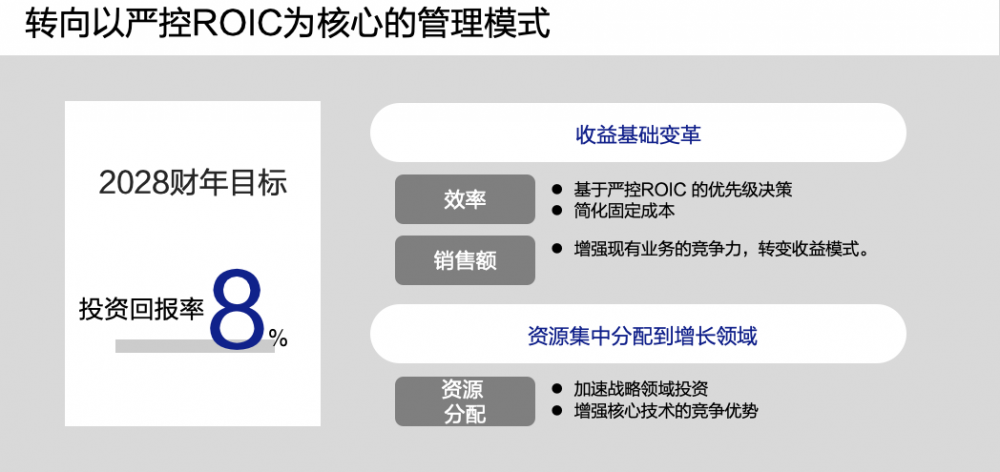 第一阶段是 长期企业愿景 落地的关键开局, “ 转型 ” 成为 核心关键词 。 截至目前,爱普生的业务结构高度依赖成熟市场,在第一阶段,爱普生将直面此前资源配置、资本效率等挑战,转型盈利基础,并将资源重点投向增长领域。以ROIC为核心管理指标,爱普生力争在 2028 财年实现 8% 的投资回报率目标,为可持续增长奠定坚实基础。