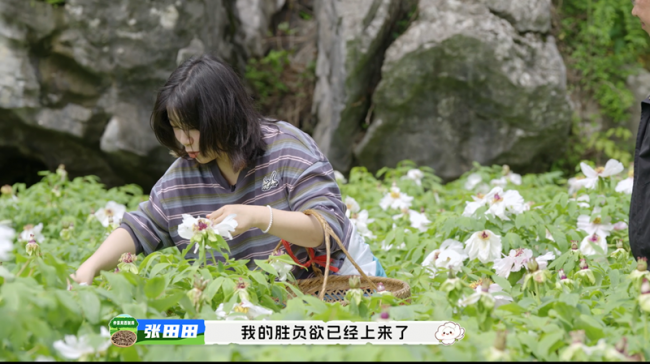第一关,凤丹种植田里摘花泡茶。嘉宾们手持竹篮穿梭花田,将新鲜的凤丹花瓣采下,现场冲泡。一碗清甜的花瓣茶入口,劳作后的疲惫消了大半——凤丹花瓣含有黄酮类物质,可食用,也可用于制作护肤品,是本地药农的经济来源之一。一朵花的价值,不止于观赏,这是嘉宾们在田埂上学到的第一课。