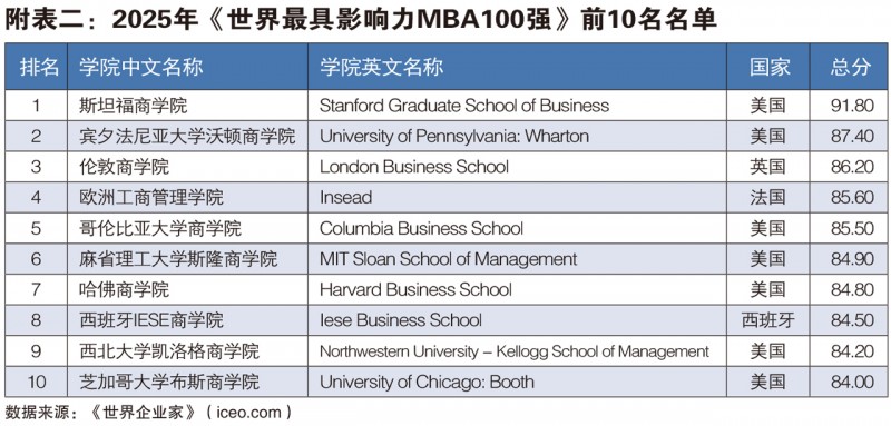 《世界企业家》杂志同期发布了2025年“世界最具影响力MBA100强”排行榜,斯坦福商学院、宾夕法尼亚大学沃顿商学院、伦敦商学院排名前三。主办方已经连续23年对世界和中国的MBA教育机构进行测评,今年中国共有14所商学院入选,比去年增加1所。引人注目的是,前10名商学院中,美国共占据了7席,遥遥领先于其他国家,英国、法国、西班牙各有1所入榜[见附表二]。总体上看,在MBA面临数字化和其他竞争压力的情况下,因为报名人数降低,排名靠前的学校的录取率继续攀升。