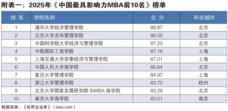 9月24日,世界经理人集团、《世界企业家》杂志联合编制的2025年(第二十三届) “中国最具影响力MBA排行榜”在香港发布,清华大学经济管理学院、北京大学光华管理学院、中国科学院大学经济与管理学院、中欧国际工商学院、上海交通大学安泰经济与管理学院列前五。牛津大学赛德商学院营销学荣誉教授斯蒂芬·沃格(Prof. Steve Woolgar)、哈佛大学商学院工商管理荣誉教授约翰·戴腾(Prof. John DEIGHTON)、加州大学伯克利分校营销战略学教授米格尔·维拉斯·博阿斯(Prof. J.Miguel BOAS)、香港大学经管学院营销学教授萨拉·金(Prof. Sara KIM)等出席发布会并发表了主题演讲。[见附表一]