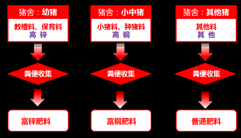 铜和锌在畜禽粪污中的含量,在畜禽养殖中具有明显的阶段性,可以分类收集和利用。以规模性养殖场为例,高铜高锌的粪污占总量20-25%,其它80-75%则为普通常规粪污。因此,可以在全国大中型畜禽养殖场推广按高铜、高锌、普通粪污的分类进行收集、储运和处理,对于微量元素铜和锌的循环再利用具有重要的意义,同时排出的污水经过预处理后可制成水肥用来进行牧草种植基地的灌溉用水进行再利用。