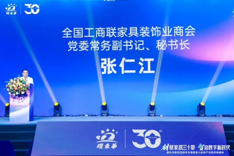 随后,中国林产工业协会会长周鸿升,全国工商联家具装饰业商会党委常务副书记、秘书长张仁江,广东省家具协会会长王克,里水镇政府党委委员、副镇长邱安邦依次上台,从行业趋势、民营经济活力及地方产业发展等角度,对耀东华三十年来所取得的成就表示高度认可。