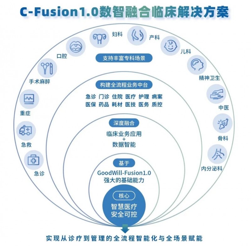 在临床方面,重点展示基于GoodWill-Fusion平台的数智融合临床解决方案C-Fusion1.0,其核心特点是智能化、专科化,助力医院实现从诊疗到管理的全流程智能化与全场景专科赋能。