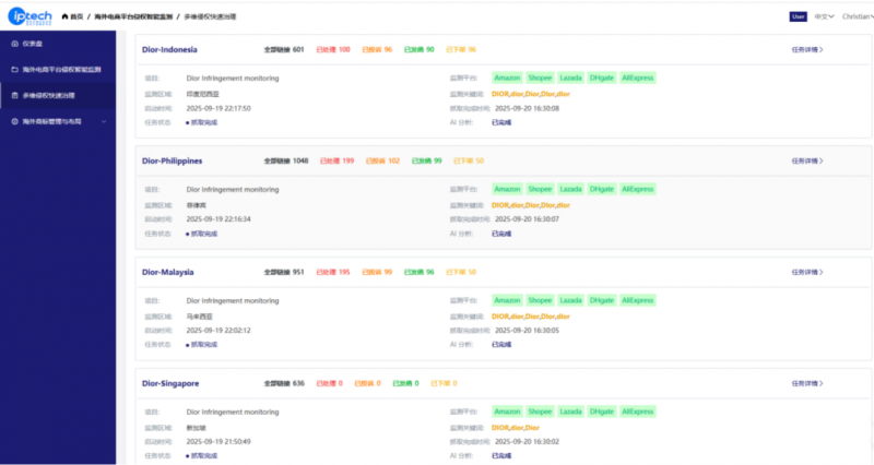 7×24小时全网监控:对Amazon、eBay等全球主流电商平台进行不间断扫描。