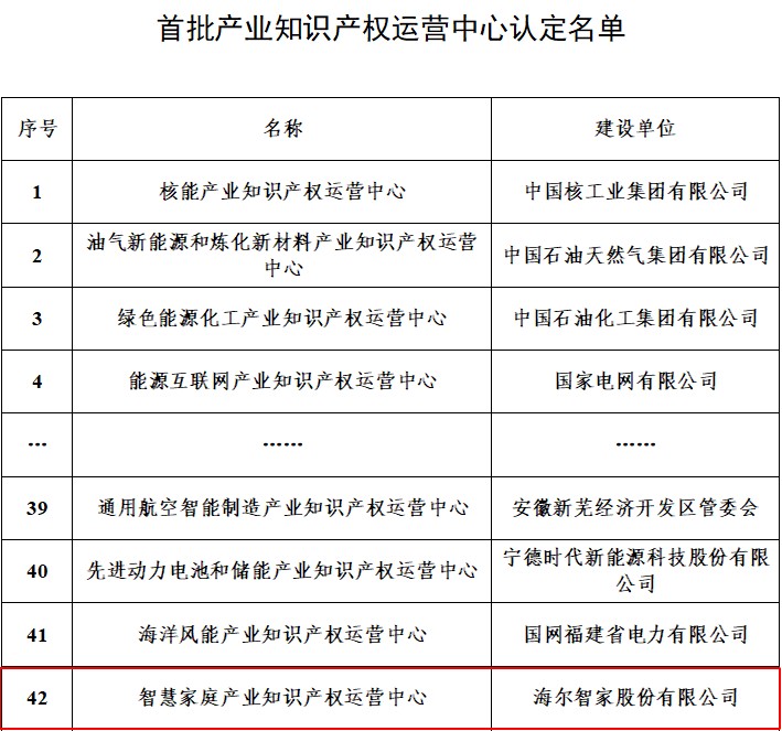近日,国家知识产权局公布了首批国家级产业知识产权运营中心认定名单,全国共有65家单位入选。其中,海尔获批筹建的家电业首个知识产权运营中心——“智慧家庭产业知识产权运营中心”喜获国家级认可,成功入选首批名单。