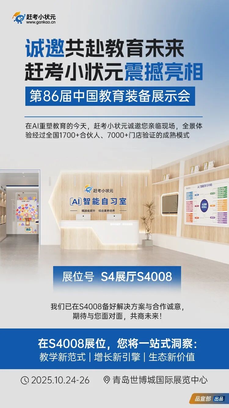 第86届中国教育装备展示会,作为全球教育装备领域的“风向标”盛会,将于2025年10月24日至26日在青岛世博城国际展览中心举行。这不仅是一次行业成果的集中展示,更是一场关于教育未来的思想碰撞。我们——赶考小状元,将在S4008展位,以一份由 “1700余位合作伙伴、7000多家落地门店” 共同书写的实践答卷,为您呈现一个截然不同的答案。