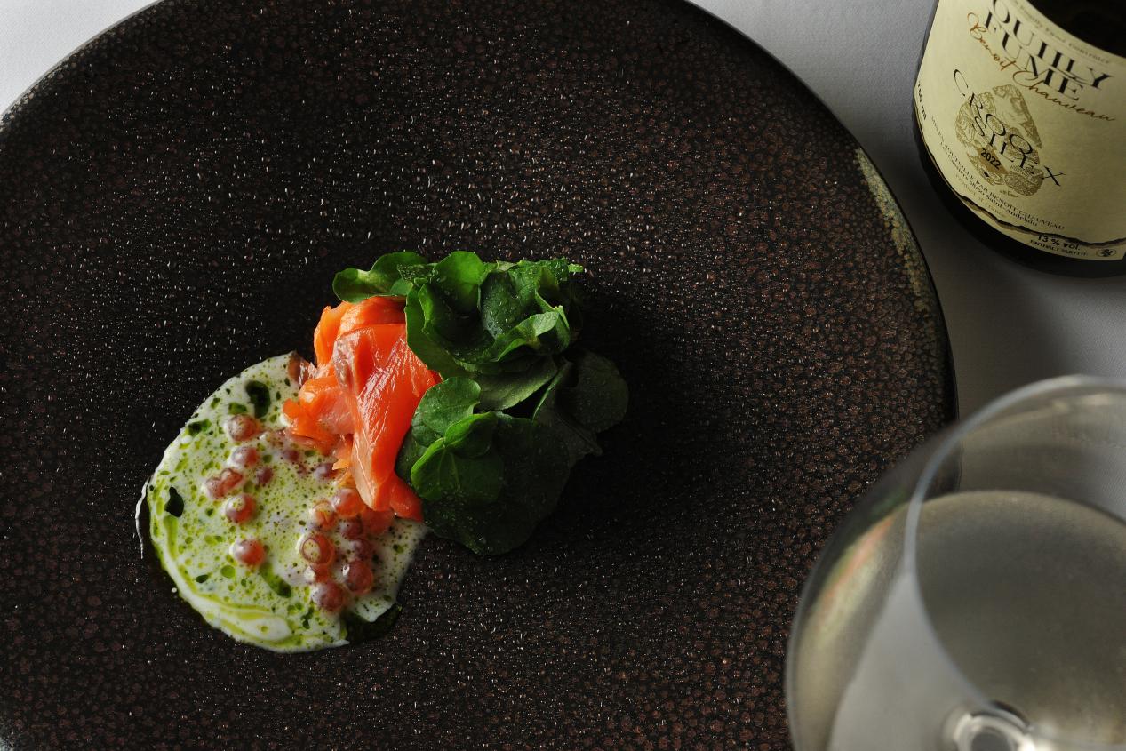 轻熏挪威鲑鱼以柔和烟香开启味蕾,搭配以鱼子与酸奶调和的细腻酱汁,并融入柚子香气的西洋菜沙拉。佐酒选用来自卢瓦尔河谷的白葡萄酒,带有苹果与洋梨的果香及清冽余韵,与鲑鱼鲜味完美呼应,形成优雅清爽却不失圆润平衡的酒食协奏。