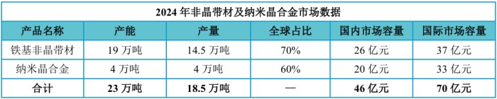 按照铁基非晶合金带材18元/kg的价格计算,2024年国内市场需求14.5万吨,国内市场容量约为26亿元人民币,全球市场需求20.7万吨,全球市场容量约为37亿元人民币。
