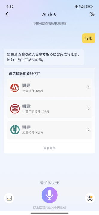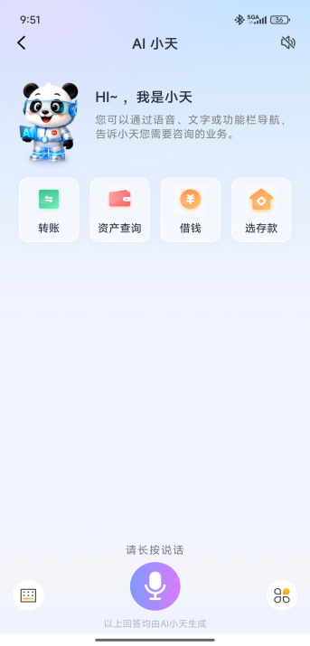 交互革命:从“翻界面”到“聊业务”,方言操作打通服务堵点 “以前用手机银行,光找‘转账’入口就要翻半天,现在跟‘小天’说句四川话就能转钱,太方便了!”成都市民刘阿姨的体验,道出了不少用户的心声。 四川天府银行AI手机银行彻底重构交互逻辑,以“对话即服务”替代传统手动操作。用户无需记忆复杂功能路径,无论是“查本月工资到没到”“还信用卡账单”,还是“查年度消费账单”,只需用日常语言向AI客服“小天”提出需求,系统就能精准识别意图,自动补全信息并完成操作。针对西南地区用户语言习惯,产品特别适配四川话、重庆话等方言识别功能,识别准确率达95%以上;同时优化大字体显示、语音指令简化等适老化设计,让适老群体无需学习复杂操作,仅凭“说话”就能轻松使用核心金融服务,真正实现“零门槛”用卡。