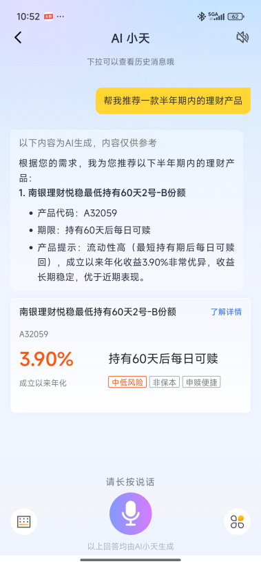 服务向前:权益保障“主动送上门”,疑问秒解答 “办理理财时,AI主动告诉我‘产品起购金额1万元,到期前不能赎回’,避免了我误操作;后来问收益怎么算,它直接调交易记录,一步到位讲清楚,不用再打客服电话。”用户张先生对服务效率赞不绝口。 传统金融服务中,用户常因“不懂规则”“疑问难解决”困扰,而这款AI手机银行将消费者权益保护“前置”。用户办理业务时,系统会自动弹出产品规则、费用说明、风险条款等关键信息,帮用户提前规避潜在争议;若有疑问,AI“小天”能基于对话上下文,快速调取交易记录,给出清晰解释,同时提供申诉路径与辅助材料,支持用户自助完成问题申报与闭环处理。数据显示,该功能上线后,用户业务咨询解决效率提升60%,网点及客服电话压力显著降低。 此次四川天府银行AI手机银行的推出,不仅是一次产品升级,更是一场金融服务的“供给侧改革”。它以技术创新破解了“年轻人嫌麻烦、适老人群不会用”的行业痛点,让金融服务真正做到“全年龄段覆盖、全场景适配”,也为“科技如何让金融更有温度”提供了可复制的实践样本。