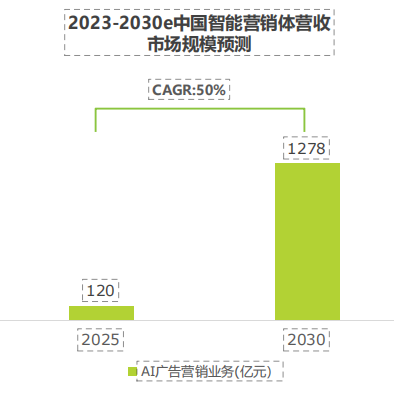 而中国市场的表现更为迅猛——艾瑞咨询预测,2025至2030年,中国营销智能体市场规模将以50%的复合年增长率(CAGR) 爆发式增长。