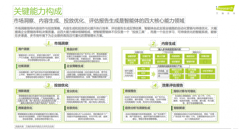 《报告》指出,营销智能体的价值已从提升“执行效率”升维至构建“增长确定性”。其核心能力覆盖四大领域:市场洞察、内容生成、投放优化和评估报告。
