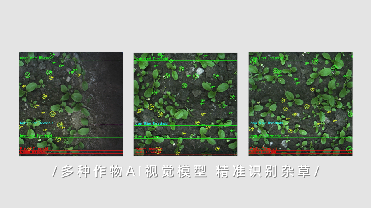 农田环境是机器视觉领域的重大挑战。苗期作物与杂草形态相似、相互交织,加之光照变化、泥土遮蔽、雨水干扰等复杂因素,使传统识别方法误差率高、实用性有限。为解决这一难题,蔚蓝引擎构建了完整的“感知·决策·控制”技术闭环。系统搭载高速高清工业相机,搭配补光系统,具有极强的环境光抗干扰能力,在复杂光线下仍可稳定捕获图像。基于深度学习算法的AI视觉系统,通过对海量农作物与杂草图像数据进行训练,能够在毫秒内完成目标识别与定位,精准区分作物与杂草,将目标坐标指令发送至高精度振镜控制系统,在运动中实现激光束“指哪打哪”,并跟随目标进行运动打击。