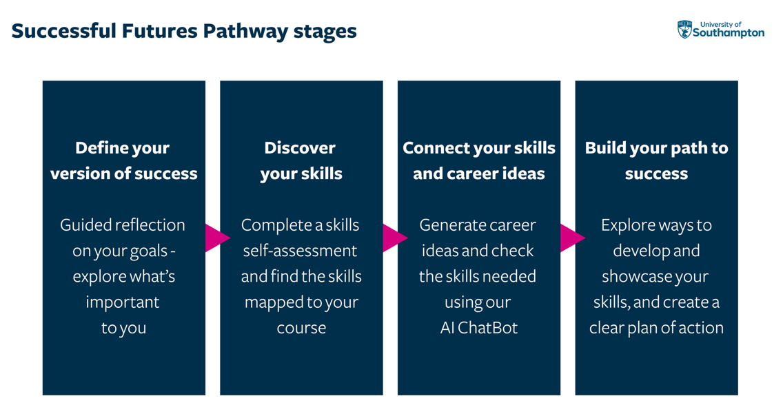 Successful Futures Pathway是面向全体南安普顿大学学生的标志性在线职业发展平台,引导学生进行目标反思、优势识别、能力差距评估,制定行动计划,并对接真实的实习与项目机会。