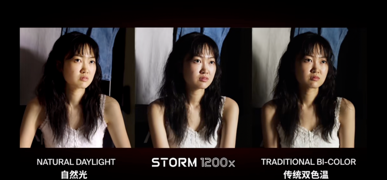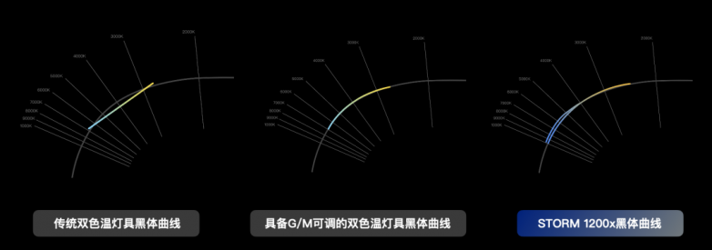 传统LED灯只会采用上述中的某一种标准,而爱图仕STORM系列的双色温灯具(STORM XT52、STORM 1200x、STORM 700x、STORM 400x)均内置CIE日光模式和黑体模式两种白光标准,能让创作者快速匹配不同创作环境,获得真正的高质量白光。