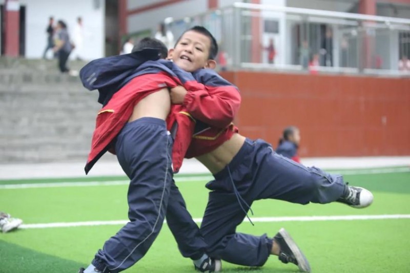 四川马边项目学校孩子在新操场上开展摔跤比赛
