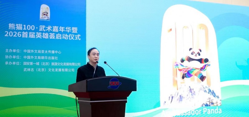中国外文局亚太传播中心总编辑赵珺在致辞中表示:“‘十五五’规划建议明确提出‘文化繁荣兴盛是中国式现代化的重要标志’。中国外文局亚太传播中心发起举办‘熊猫100·武术嘉年华暨2026首届英雄荟’活动,创新融合熊猫与武术两大文化标识,旨在搭建一个集体育竞技、文化展示、产业合作与国际交流于一体的综合性平台,希望能够实现三大愿景:一是以武术为桥,弘扬中华优秀文化,彰显人类共同价值;二是以熊猫为媒,构建国际交流新平台,增进理解与认同;三是以内容为根,打造武术传播新生态,拓展影响边界,推动武术文化国际传播迈入新阶段。”