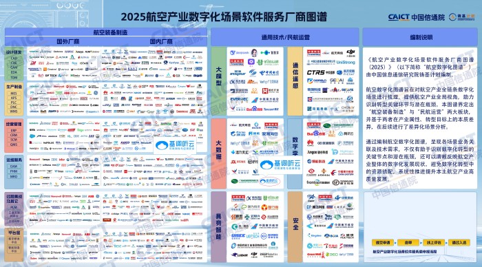 在此背景下,中国信息通信研究院(以下简称“中国信通院”)近日于北京成功召开“航空数字化建设成果交流会”,会上集中展示航空产业数字化建设的阶段性成果,并正式发布《2025航空产业数字化场景软件服务厂商图谱》。