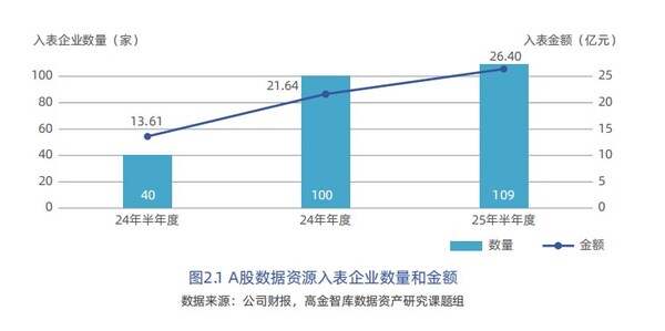上市公司层面,根据上市公司披露的2025年半年度报告,截至2025年8月31日,在A股上市的5000余家企业中,有109家上市公司披露了数据资源入表的相关事项,共涉及入表金额26.40亿元,数据资产入表总体规模稳健增长,但增速环比较2024年有所放缓。