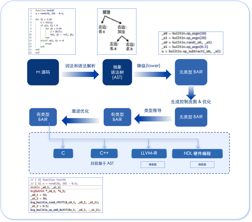 代码生成工具箱:新增C语言生成功能,目前可实现北太天元内置函数与自定义函数向C++/C代码的便捷转换。该工具箱已对浮点型、整型、字符、逻辑型等基础数据类型进行全面覆盖,支持常用矩阵生成函数、运算符、控制语句及自定义函数等核心语法的代码生成。