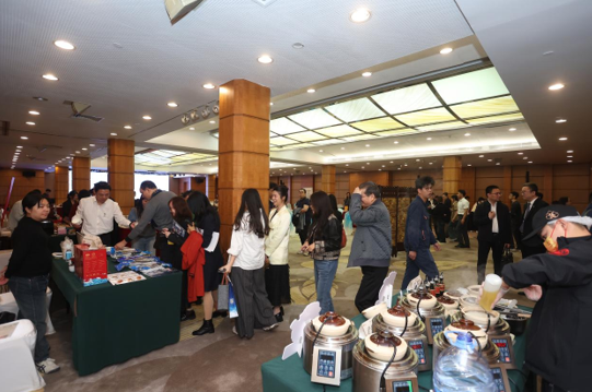 当晚18时30分,交流会现场气氛热烈。为了让嘉宾直观感受岭南地标食材的魅力,主办方在现场特别搭建了特色食材展位区。来自全省各地的优质食材企业纷纷亮出“看家本宝”:东源县板栗发展总公司带来了颗粒饱满、甘甜粉糯的东源板栗;珠海壹条鱼食品科技有限公司展示了深海养殖的高品质海鲜;深圳市后山茶业有限公司则呈现了醇香的名茶;古井集团带来了国家地理标志产品——被誉为酒中牡丹的古井贡酒酒。此外,韶关市兴顺佳农业科技发展有限公司、广东锦泰农副产品有限公司等企业也展出了众多极具地方特色的农副产品。