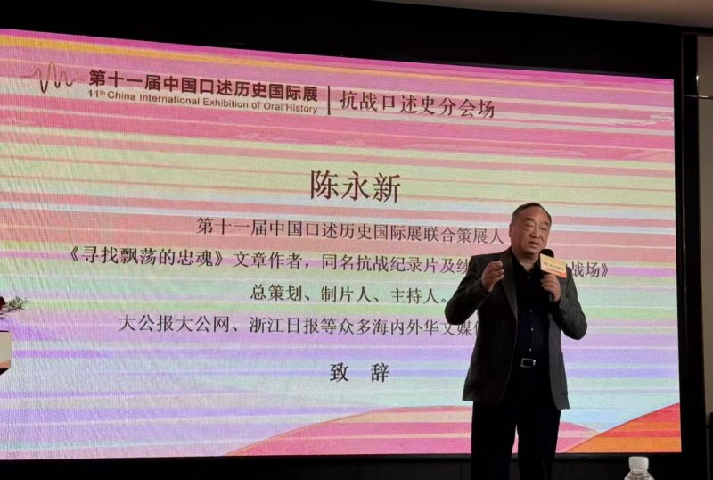 诸暨远征大酒店作为首次中国口述历史国际展·抗战口述史指定的分会场,第十一届中国口述历史国际展联合策展人、诸暨远征大酒店董事长,《寻找飘荡的忠魂》文章作者、同名抗战纪录片及续集《重返缅甸战场》制片人陈永新对到场的学界同仁、文史研究者、记忆传承者及各界项目代表表示热烈欢迎并发表了精彩致辞。他表示,第十一届中国口述历史国际展分会场能设在诸暨远征大酒店深感自豪,同时,不敢辜负,不敢懈怠。