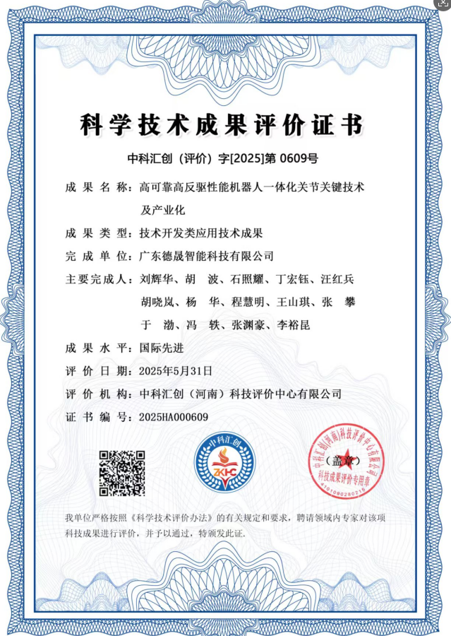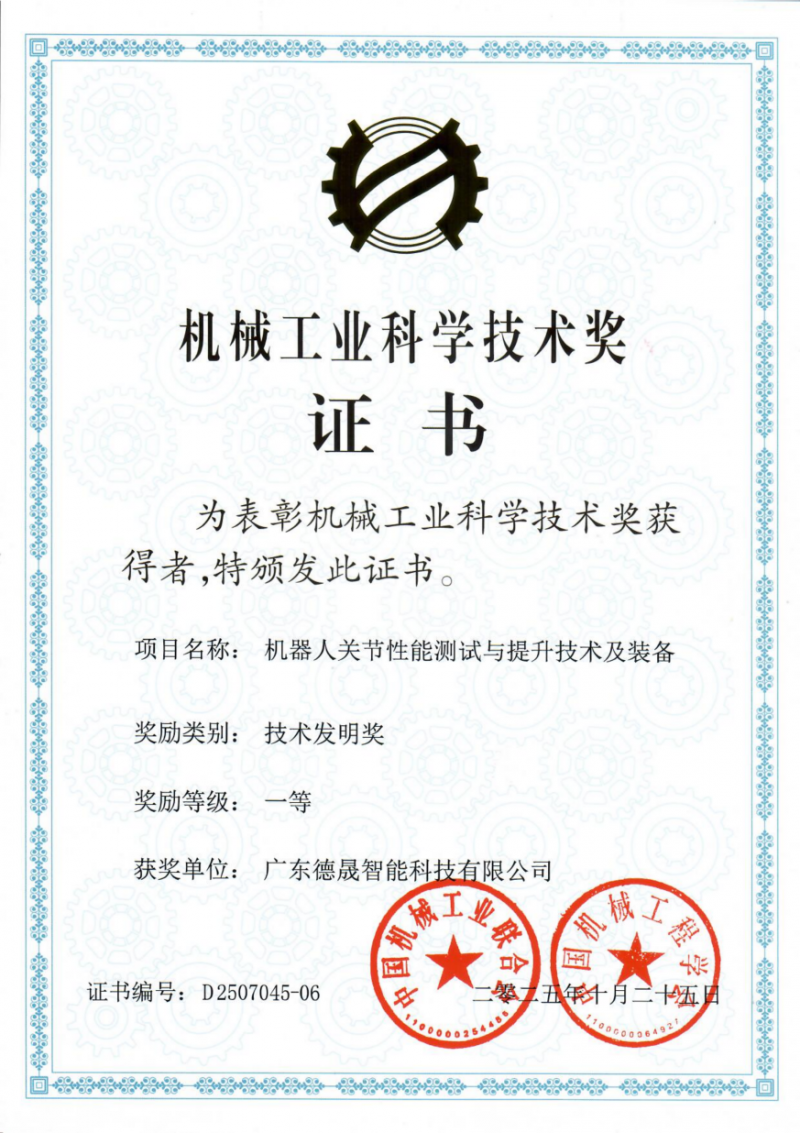 今年10月,2025年度“机械工业科学技术奖”获奖名单揭晓,广东德晟智能科技有限公司凭借“机器人关节性能测试与提升技术及装备”项目,斩获技术发明一等奖。
