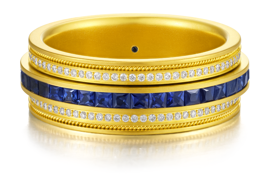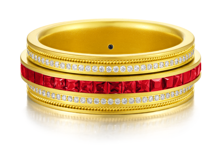 在设计上,「时来运转」汲取帝王扳指的灵感,以“回纹方”与“公主方宝石”象征循环不息的好运,阶梯式结构寓意身份与地位的攀升,九层美光圈则如层层光晕,闪耀指尖。细节处更见匠心:内壁镶嵌黑白钻石,昼夜守护;手工花丝、镜砂等工艺的融入,让作品在转动之间流光溢彩,展现出珠宝级的高级质感。