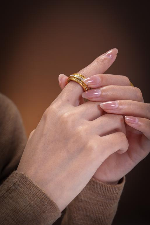 「时来运转」系列的诞生,正是这一理念的极致体现。它不仅是首饰,更是一场技术与美学的双重革命。君佩历时七年研发,突破黄金质地偏软、难以实现顺滑转动的技术瓶颈,通过独创的“密金工艺”提升金属硬度,并融合高级腕表中的精密转动结构,最终实现了黄金指环15秒左右的丝滑转动。每一次转动,不仅是指尖的触感体验,更是心理上的减压与安抚,仿佛每一次轻旋,都在为生活注入一丝从容与好运。