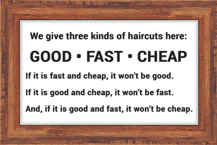 在商业的复杂棋局中,企业要想脱颖而出,找准自身价值定位并有效践行是关键。就像缔柯圣Dixon总部附近理发店门口那句幽默标语“我们提供三种发型:好、快、便宜——三者只能选其二”所揭示的,任何企业的价值主张必须在“价格、质量与服务”三者间寻求最优平衡。