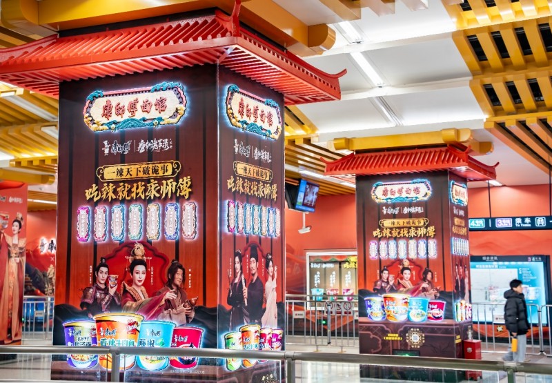 除了大唐不夜城的快闪盛典,康师傅还在西安地铁大雁塔站打造了沉浸式主题车站。站内大面积的创意墙贴、异形灯箱包柱等视觉装置,将番外剧中的“康师傅面馆”场景、七款特色辣口味产品矩阵及《唐诡》的国风氛围巧妙结合,把通勤空间转化为辣饮食文化传播的微型展厅。这种 “文化传递 + 地铁引流 + 快闪引爆” 的全链路布局,让辣文化从餐桌延伸至城市公共空间,让消费者在舌尖的地域辣文化探索中,获得满满的“文化归属感”与“放松体验感”。