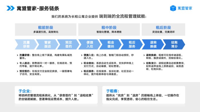 保租房管理的核心是“合规为基、保障为本、效率为要”,而公寓管理系统正是实现这一目标的关键工具。通过数字化手段,系统打通保租房管理全流程,既解决人工管理中的合规漏洞、效率低下问题,又能对接监管平台,实现精准管控与数据溯源。寓盟管家完善的业务功能、无资金池的资金安全保障、三级等保的合规支撑以及灵活的定制能力,深度贴合保租房的运营需求,既能解决当下的管理难题,也能适配未来规模化发展的需求。选择寓盟管家,就是选择一种“合规可控、高效便捷、可长期支撑”的保租房管理模式,为保租房高质量运营提供有效的数字化支撑。