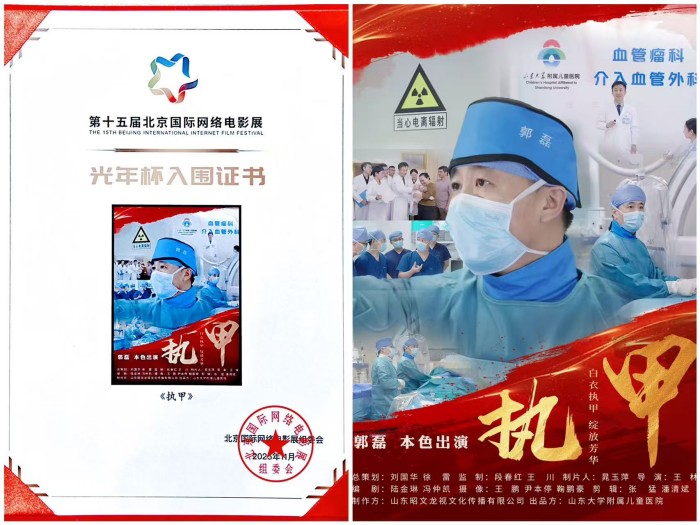 荣获“最佳公益影片”的《执甲》,由山东大学附属儿童医院与山东昭文龙视文化传播有限公司联合策划、出品。影片以山东大学附属儿童医院副院长、血管瘤与介入血管外科创始人郭磊的真实事迹为主线,创新性地构建“白衣执甲、铅衣为铠、与子同袍”三重意象,层层递进刻画出一名医者十年如一日、为儿童健康披坚执锐的动人身影。影片不仅真实再现了郭磊带领团队攻克疾病、推动儿科介入医学发展的专业历程,更透过一枚党徽、一袭白衣、一件重达三十余斤的铅衣,凝练出“人民至上、生命至上”的信仰之光。