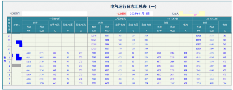 在日常运行业务管理方面,勤哲Excel服务器围绕电气设备和水轮机组运行,建立起标准化的数据采集机制。电气运行日志、水轮机组运行日志可按小时进行登记,系统自动完成数据存储与校验,确保记录完整、准确。在此基础上,平台自动生成运行日志汇总表,将零散的小时数据转化为清晰的阶段性运行结果,帮助管理人员快速掌握设备运行状态和负荷变化规律。