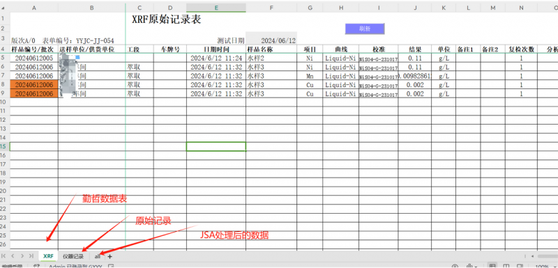 在原始记录环节,针对不同测试仪器分别建立对应的数据模板。每个模板包含一个整理后的勤哲数据表(方便存入勤哲系统)和N个原始记录表。实验员在实操过程中,仅需将原始数据粘贴至对应模板,通过点击刷新按钮,系统便可借助 WPS JSA 和勤哲表间公式,自动完成数据整理并写入数据库,避免人工录入和重复计算。