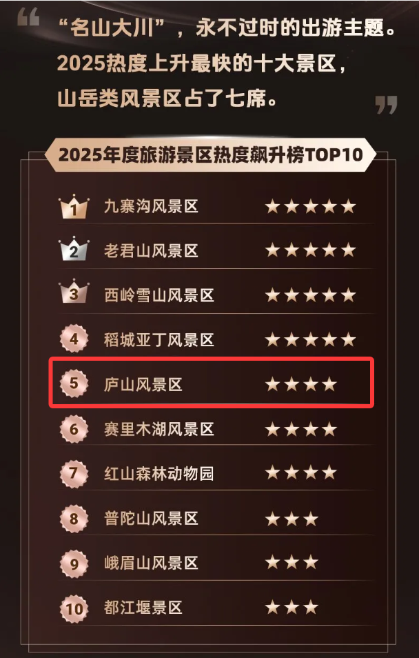 这种新场景的营造在引客入赣的层面效果尤其明显。同程旅行数据显示,截至目前,在该平台甄选榜单、登山赏景、假日热门等全国目的地推荐榜单中,江西省地市或者景区上榜次数达11次。在某机构发布的《2026元旦假期旅行消费报告》中,江西多地榜上有名。庐山风景区登上同程旅行2025年全国度假旅游景区热度飙升榜。2025年全国范围内在同程旅行平台预订江西省各类旅游产品的线上游客人次和消费金额同比均呈两位数增长。