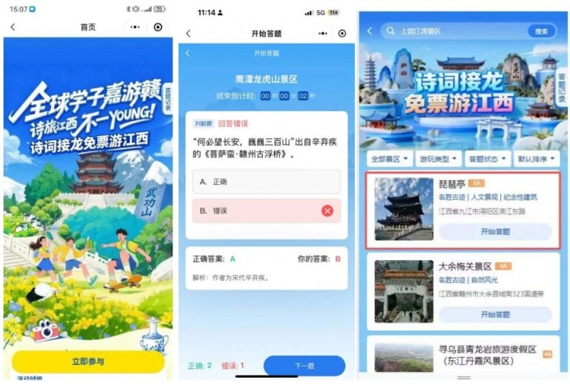 线上,“AI诗词接龙”微信小程序构建了文化与科技融合的新场景。学生通过身份认证后,即可参与“你问我答”式诗词互动,一分钟内答对三道与江西有关的诗词题,便能获得景区免票二维码,给青年游客提供“知识变现”的情绪价值。与此同时,“诗旅江西·与您同程——万名学子超级GO盲盒”通过年轻人喜闻乐见的玩法,解锁酒店、门票、交通权益,累计发放18301个盲盒、购买量超17680个,总曝光量超700万次,用“惊喜经济”激活学子的消费热情。