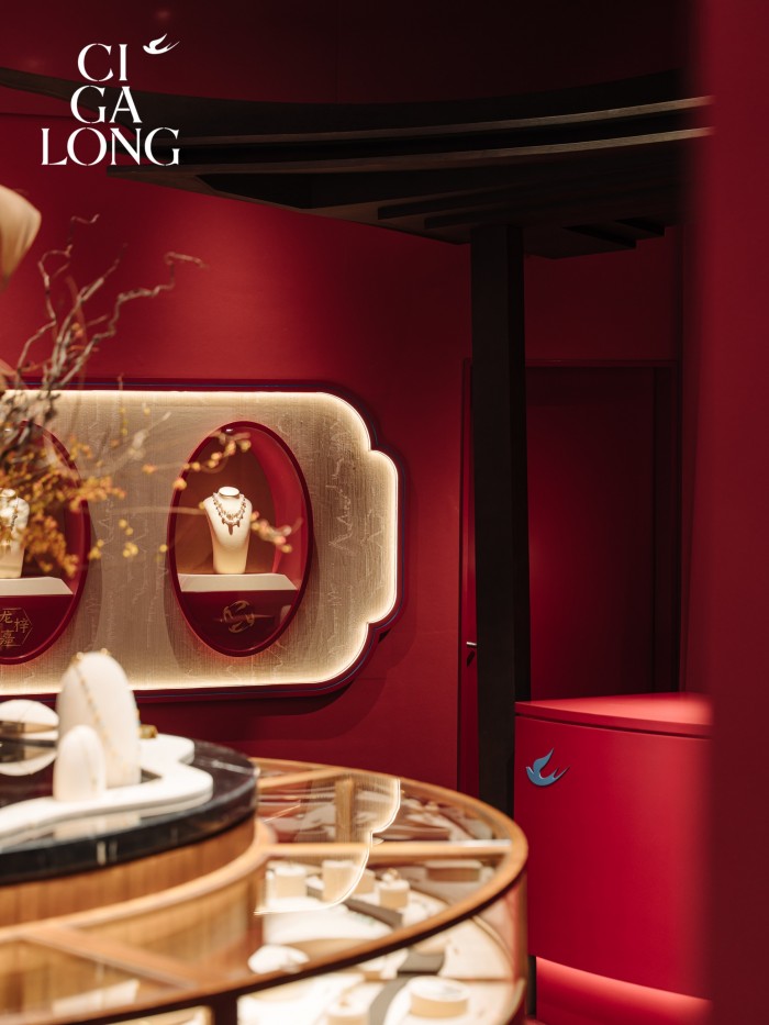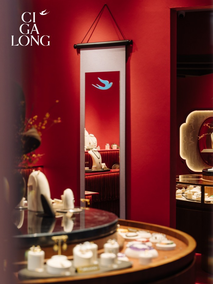 宾客循着店内如园林般的动线漫游,玛瑙红的主色映衬璀璨珠宝,宛若步入流动的光影梦境。每一件作品仿佛都在低语独特的雅事故事,试戴身侧,似能焕发独具一格的东方气韵。CIGALONG于此,自信地展开一幅独属东方的优雅画卷,将深邃的诗意娓娓道来。