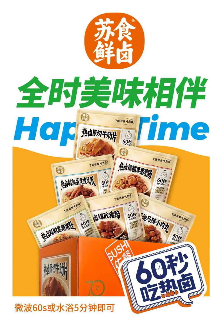 苏食食品则以全场景覆盖为核心,推出“苏食一桌菜”“苏食炖炖养”“苏食鲜卤”三大系列,构建差异化便捷肉食体系。“苏食鲜卤”系列选用自有可溯源新鲜肉源,杜绝拼接肉与冷冻肉,六大明星产品60秒速热即可还原鲜卤风味,上市半年便跻身行业“快消新品榜”;“苏食一桌菜”聚焦家庭便捷家宴,经典菜品经科学调味与锁鲜包装留存本味,简单加热即可打造丰盛家宴;“苏食炖炖养”主打轻滋补汤品,精选肉类与药食同源食材,10分钟加热便能满足日常滋补需求,精准覆盖家庭餐饮、健康养生、休闲卤味全场景。
