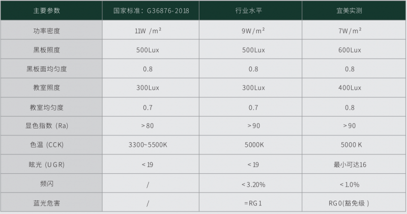 宜美照明通过系统化设计与智能调控,全面优化各项光指标:照度均匀度提升至0.8以上,眩光值(UGR)最低可达16以下,显色指数Ra≥90,并实现RG0无危害级蓝光控制,真正实现从“基础照明”到“健康护眼”的本质升级。