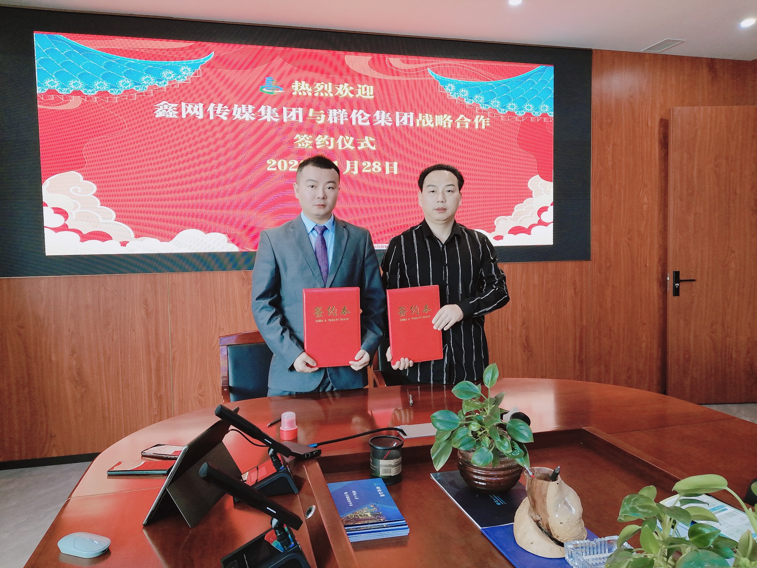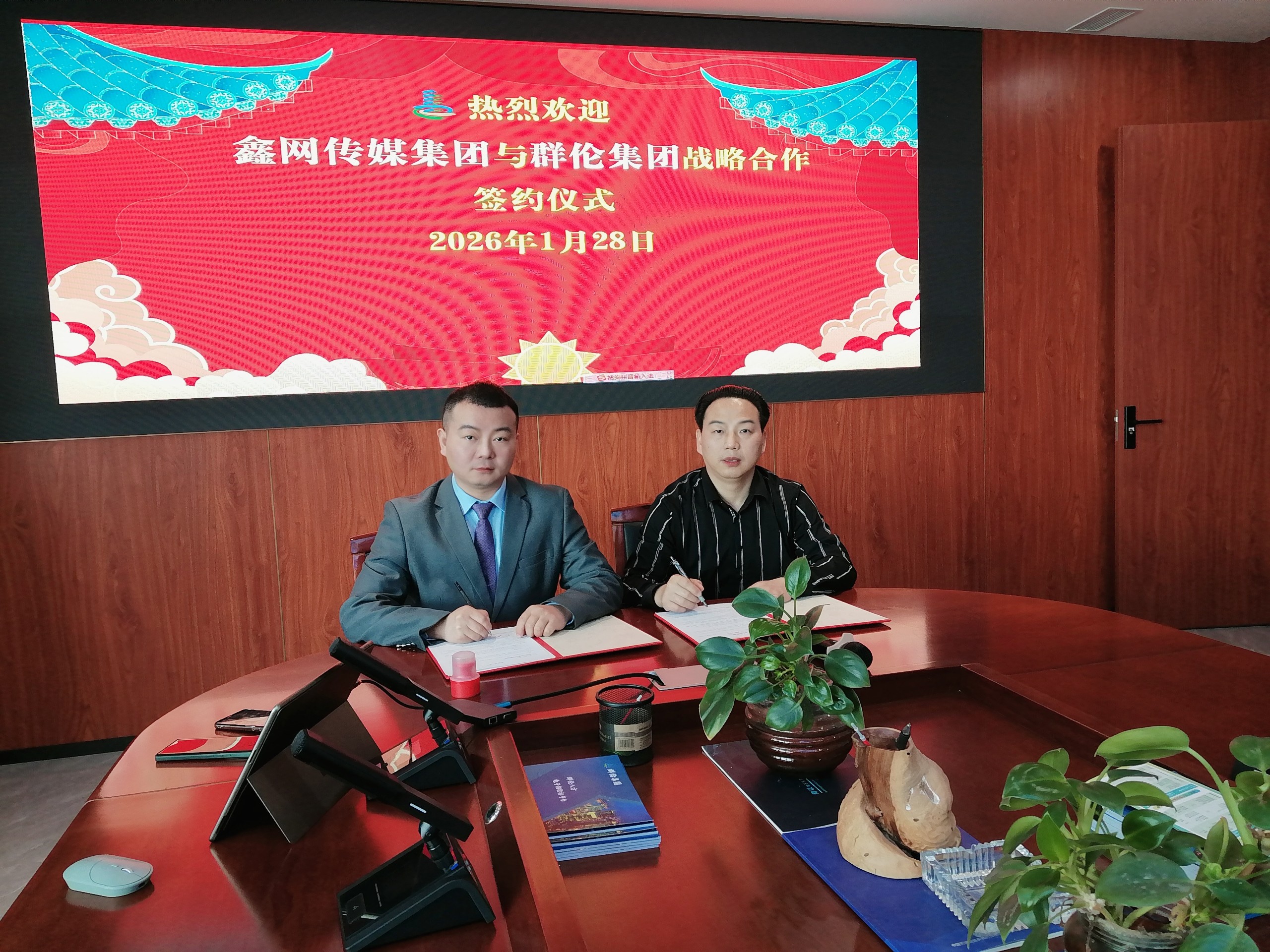 鑫网传媒集团董事长肖邦与群伦集团领导签约合影