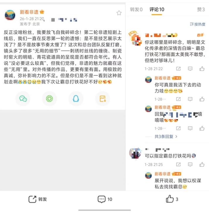 没有蓝V认证的加持,没有流量明星的引流,仅凭一句“怕非遗故事太静留不住大家的目光”的自我剖白,《闺阁绣梦》就成为了微博热搜榜上的一匹黑马。出品团队账号“剧看非遗”以普通账号身份运营,在首轮播出遇冷时发布的反思长文,坦诚了“没加V没推广是不是太理想化”的内耗,却意外引发全网破防式支持——网友们自发转发、留言,为“流量荒漠里的文化火种”呐喊,让这部扎根非遗的微短剧,在喧嚣的内容生态中站稳了脚跟。