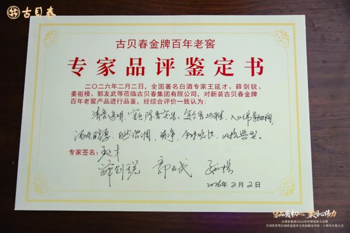 2月2日上午,在古贝春集团科研中心,一场特殊的“考试”悄然进行。中国酒业协会、山东省白酒协会等机构的权威专家,对传承经典、优化升级的“新金牌百年老窖”进行闭门品评。最终,专家组给出“清亮透明,窖香、陈香突出,复合香幽雅,入口绵柔甜润,酒体醇厚,自然谐调、爽净,余味悠长,风格典型”的鉴评结论。