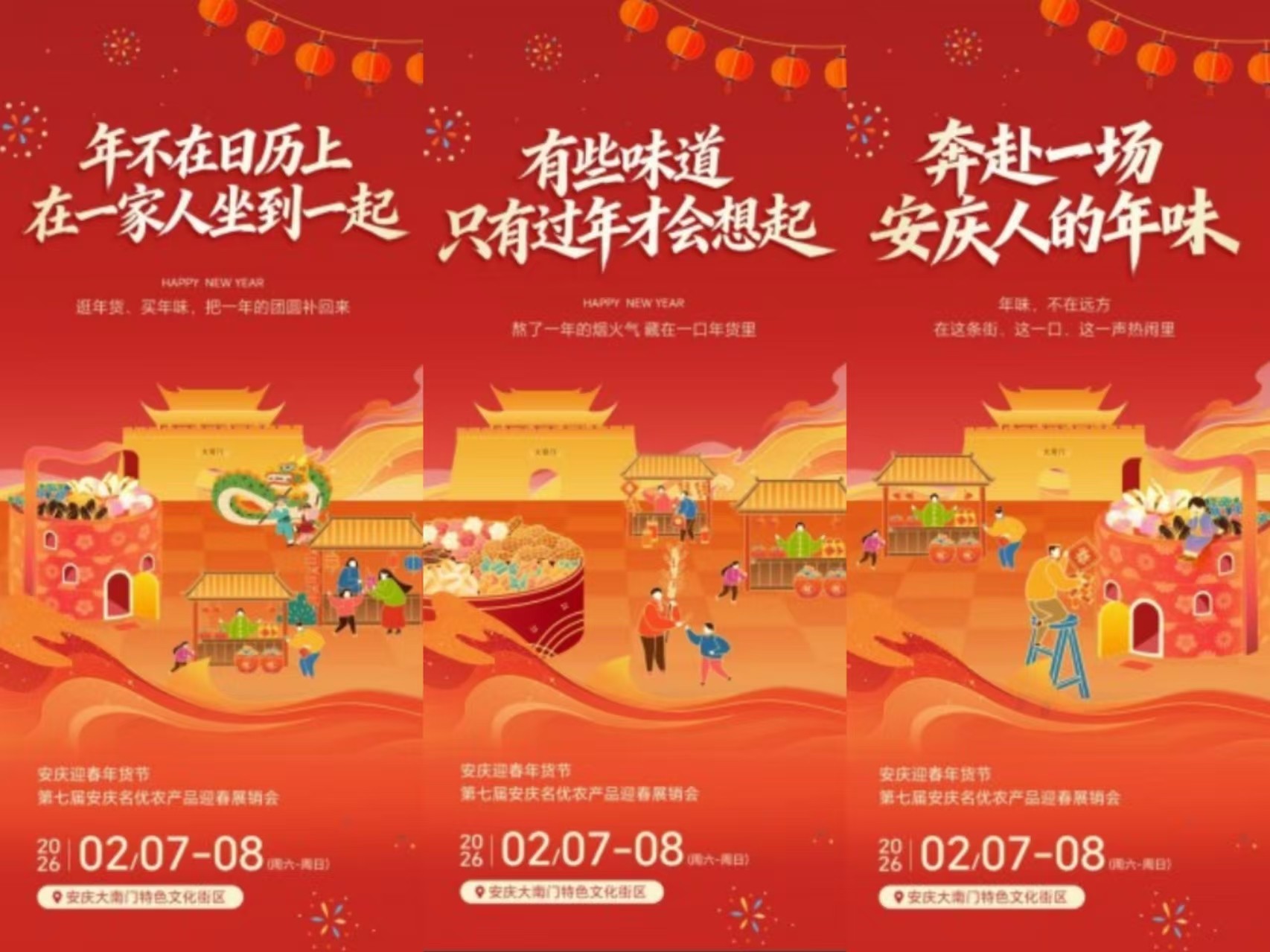 为深入推进农商文旅融合发展,营造浓厚春节消费氛围,助力优质农产品展示展销,由安庆市农业农村局主办的安庆迎春年货节暨第七届安庆名优农产品迎春展销会,将于2026年2月7日至8日在安庆大南门特色文化街区举办。