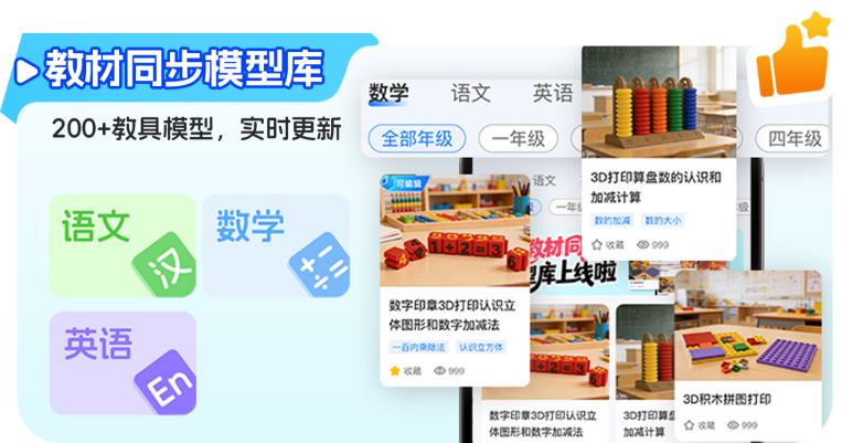 教材同步模型库:内含200+覆盖语文、数学、英语等学科的实用教具模型,并持续更新,让学习与创作紧密结合。